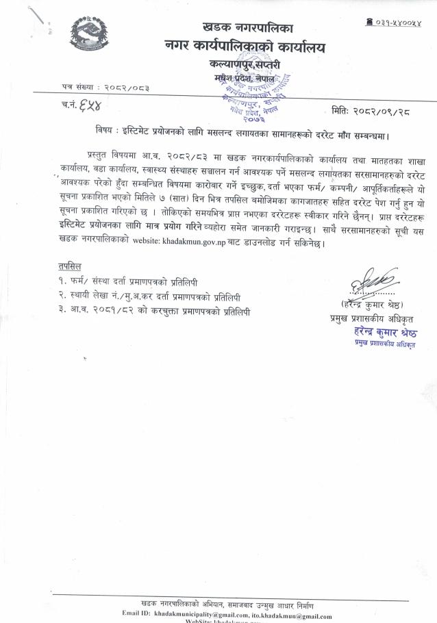 इस्टिमेट प्रयोजनको लागि मसलन्द लगायतका सामानहरूको दररेट माँग सम्बन्धमा ।
