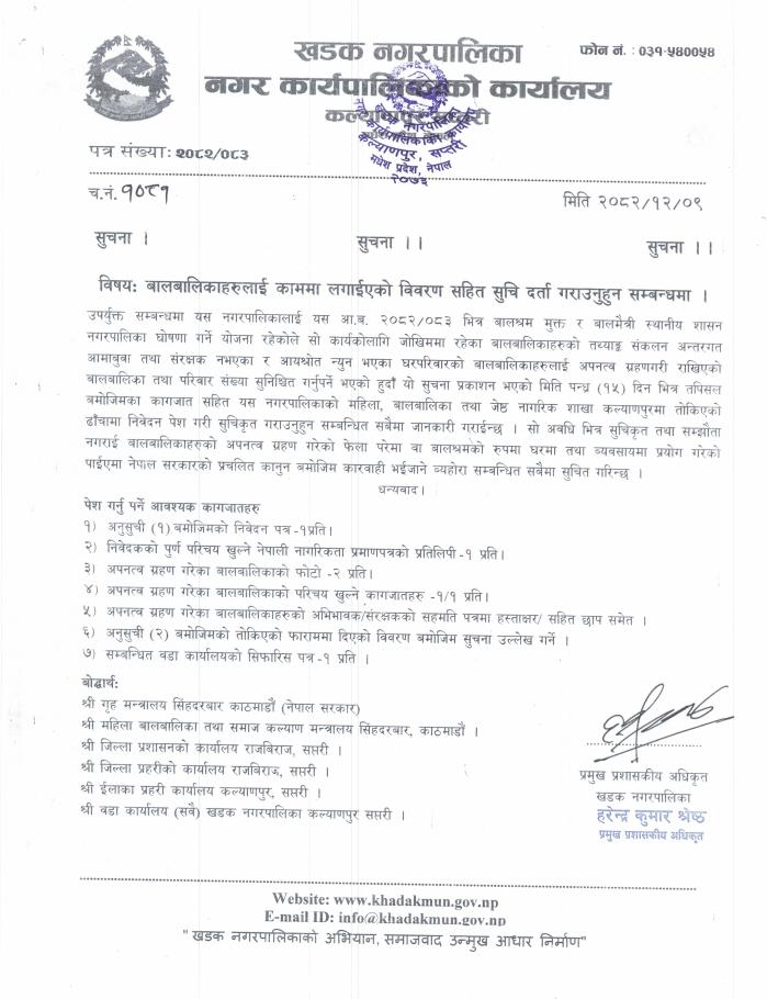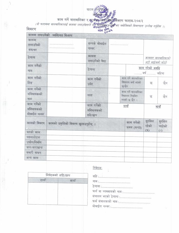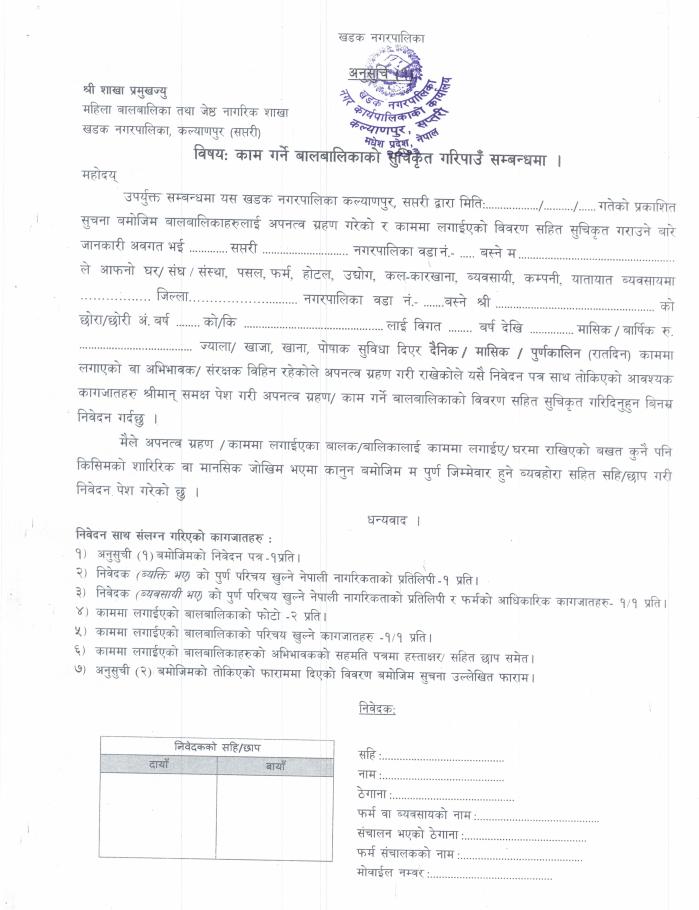 बालबालिकाहरुलाई काममा लगाईएको विवरण सहित सुचि दर्ता गराउनुहुन वारे